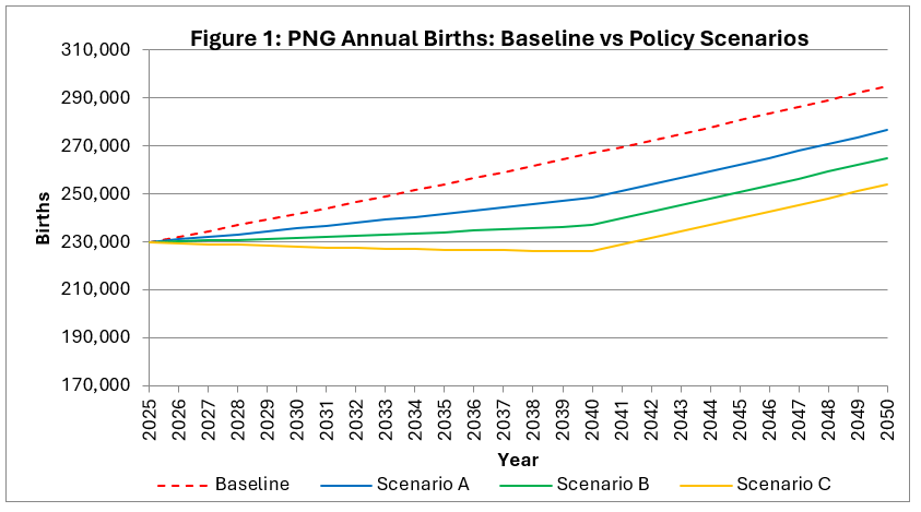 Without decisive policy intervention, annual births would reach close to 300,000 by 2050 under a conservative 1 percent growth rate (Figure 1). Family planning on its own is not enough to alter this trajectory in an impactful way. Scenario A models a reduction in unplanned births from the current 28 percent to 20 percent within 15 years, while Scenario B targets a deeper reduction to 15 percent. In both cases, the downward pressure on total births is relatively modest, still. By contrast, for Scenario C, which combines family planning with investments in education and later marriage shows a strong impact. Annual births are contained below 250,000 almost until mid-century.